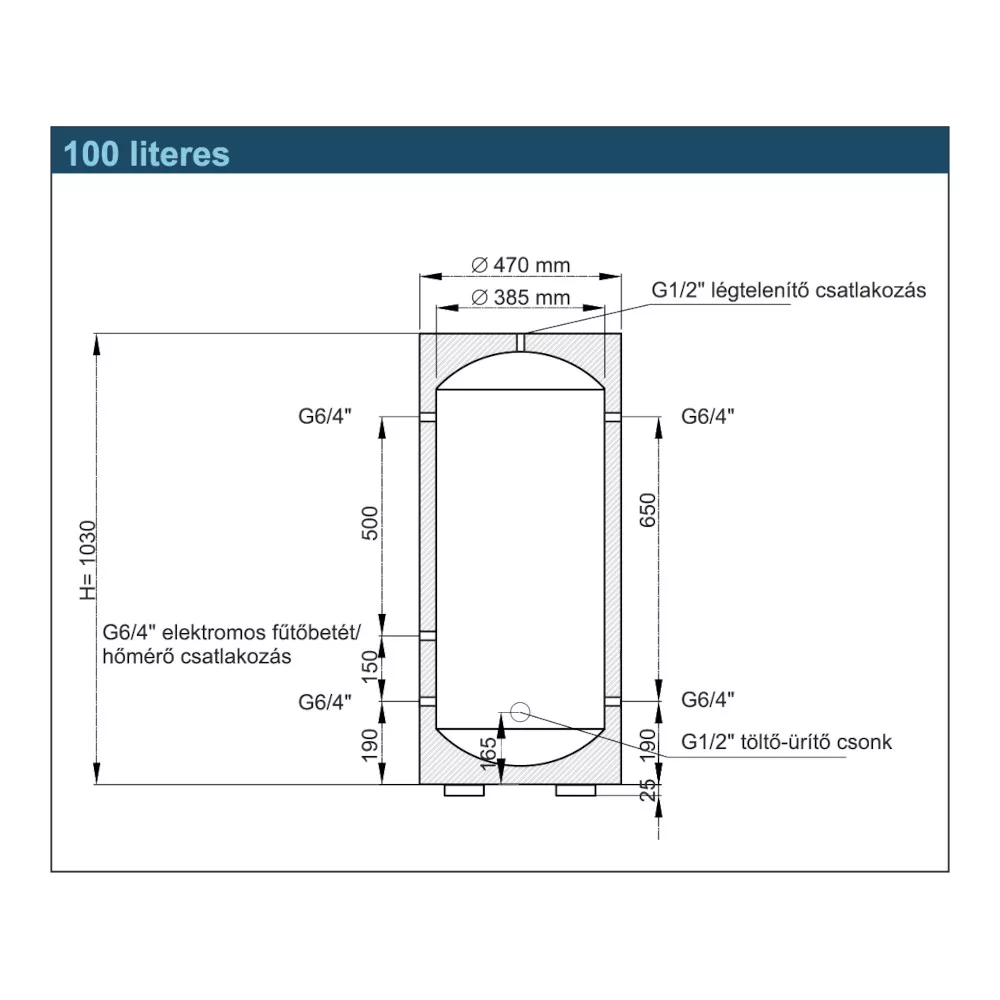 • Csatlakozások: 2×2 db 6/4″ (1 ½″) belső menetes csonk, valamint külön hőmérő- és ürítőcsonk (½″).