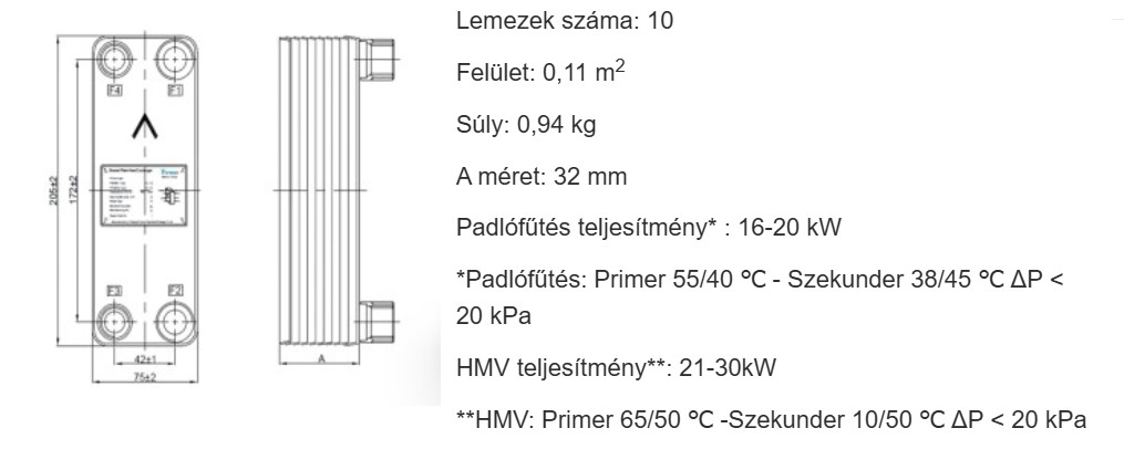 Teljesítmény és alkalmazás A tízlemezes kialakítás optimális hőcserét biztosít alacsony és közepes teljesítményigényű körök között. Padlófűtési rendszerekben 16-20 kW (Primer 55/40 ℃ - Szekunder 38/45 ℃ ΔP < 20 kPa), használati melegvíz (HMV) készítésénél pedig 21-30 kW (Primer 65/50 ℃ -Szekunder 10/50 ℃ ΔP < 20 kPa) teljesítmény leadására képes. A forrasztott technológia magas üzembiztonságot és szivárgásmentes működést eredményez.