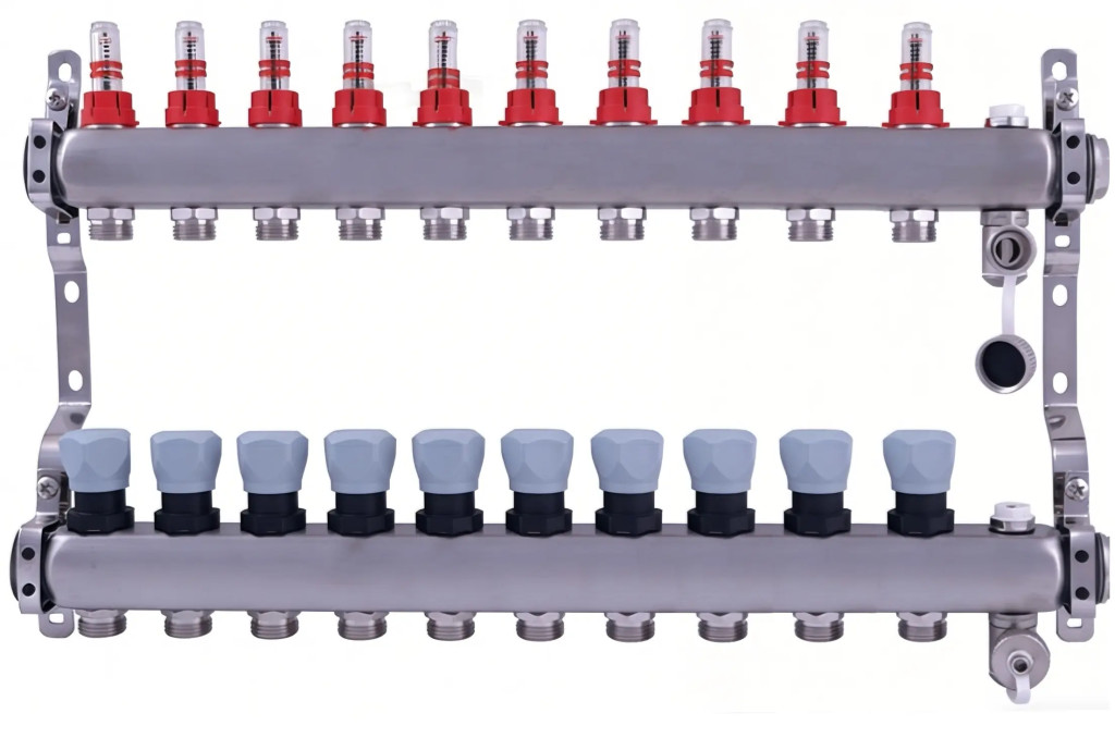 A DELTA inox osztó-gyűjtő 10 körös kivitelben, beépített szelepekkel és áramlásmérőkkel, ideális padlófűtési és fűtési rendszerekhez. Eurokonuszos csatlakozással, tartós rozsdamentes acél kivitelben.