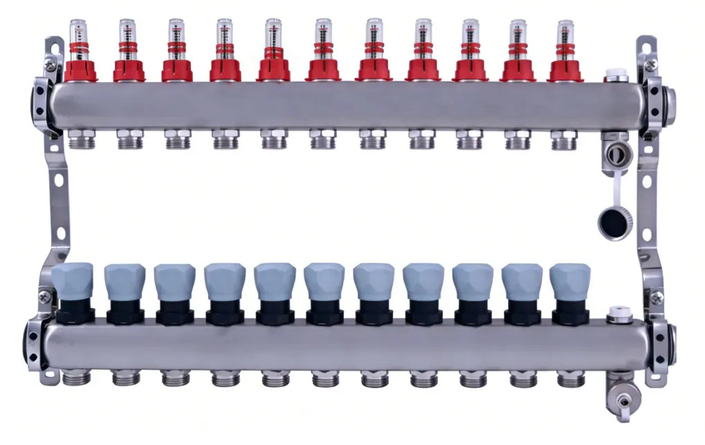 A DELTA inox osztó-gyűjtő 11 körös kivitelben, beépített szelepekkel és áramlásmérőkkel, ideális padlófűtési és fűtési rendszerekhez. Eurokonuszos csatlakozással, tartós rozsdamentes acél kivitelben.