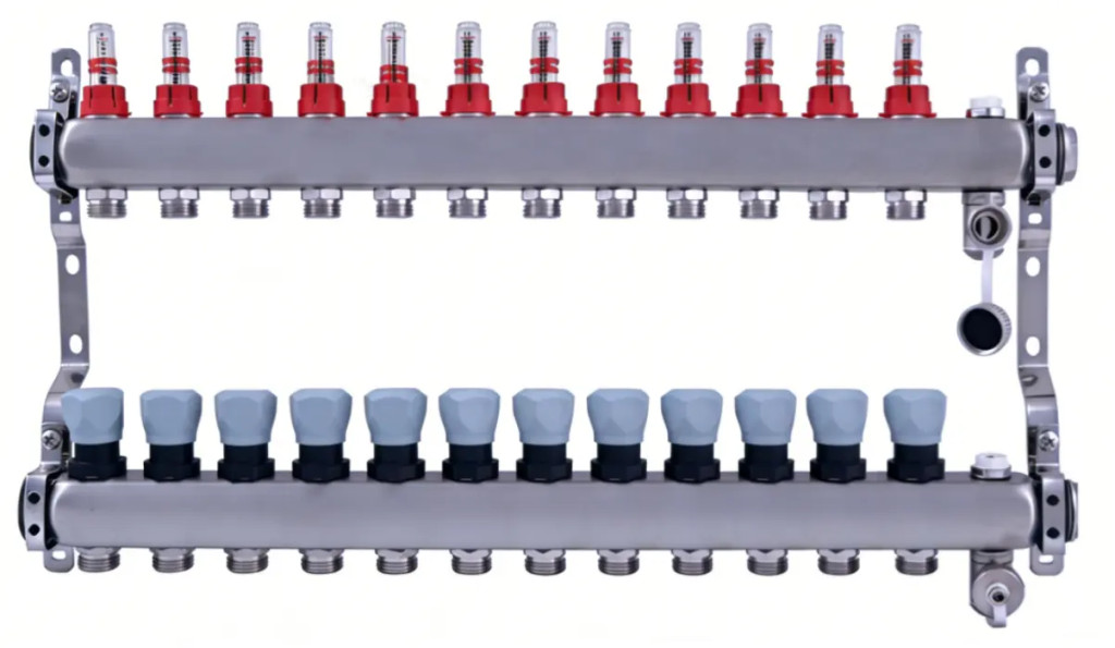 A DELTA inox osztó-gyűjtő 12 körös kivitelben, beépített szelepekkel és áramlásmérőkkel, ideális padlófűtési és fűtési rendszerekhez. Eurokonuszos csatlakozással, tartós rozsdamentes acél kivitelben.