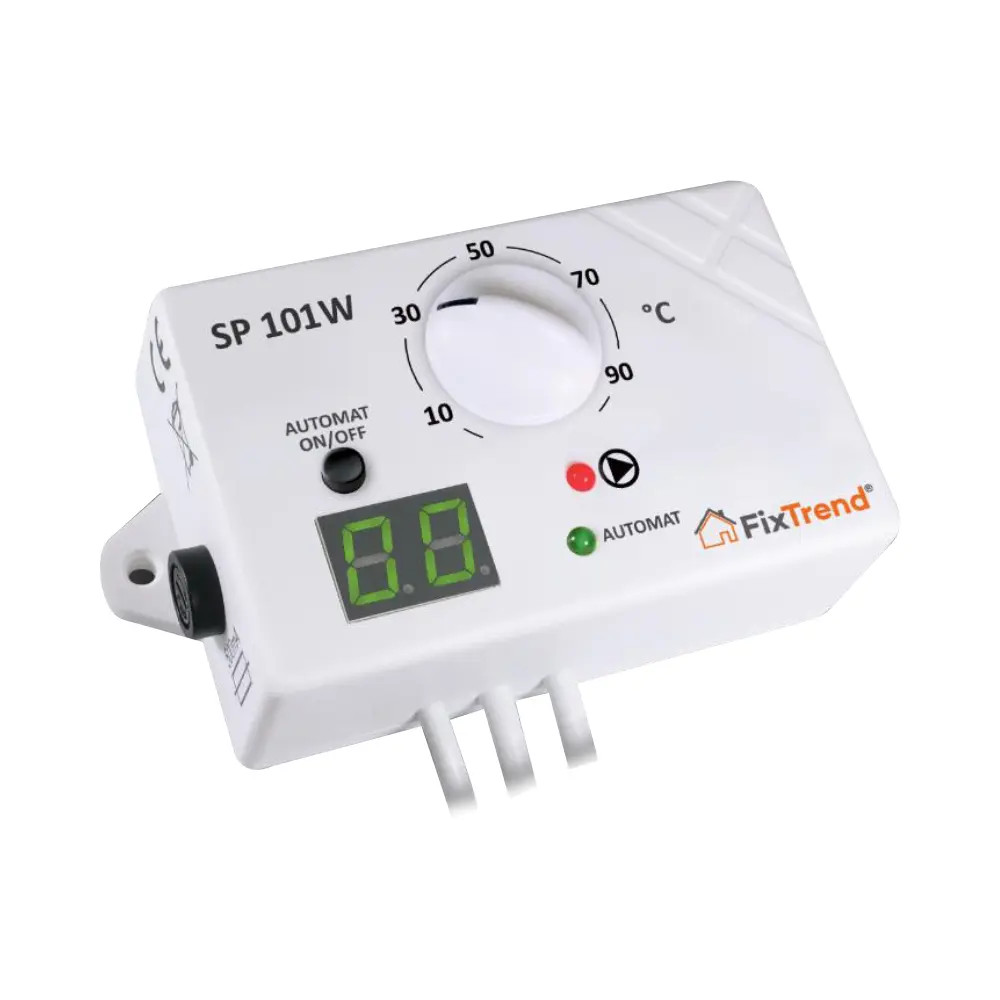A FixTrend SP101W a központi fűtéses vagy használati melegvíz (HMV) keringető szivattyúk vezérlésére tervezett, digitális hőfok kijelzős termosztát. A készülék szivattyút kapcsol be, amint a vízhőmérséklet eléri a tekerőgombbal megadott értéket, majd a hőmérséklet csökkenésekor – a gyári 3 °C-os hiszterézis érték fölött – kikapcsol. Ez ideálissá teszi mind modern, mind hagyományos otthoni rendszerekben.