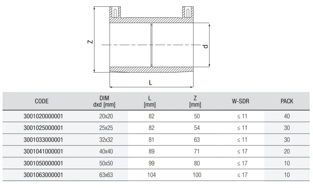 A karmantyú elektrofúziós technológiával működik, amely a 4 mm-es csatlakozókon keresztül 40 V hegesztési feszültséget használ. Ennek köszönhetően pontos, gyors és rendkívül megbízható kötés alakítható ki, minimális hibalehetőséggel. Minden idom jól olvasható jelöléseket tartalmaz — vonalkód az optikai olvasáshoz, névleges átmérő, nyomásfokozat, olvadási és hűlési idő — megkönnyítve a gyors beazonosítást és szerelést.