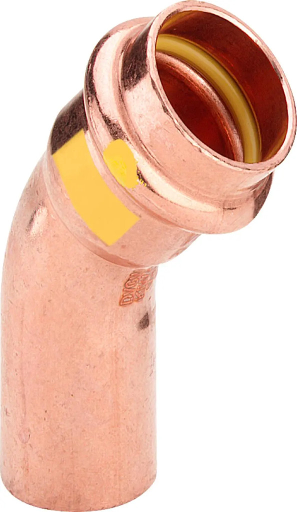 A Viega Profipress G 45°-os ív (bedugóvéges) egy speciális kialakítású vörösréz idom, amely lehetővé teszi a gázvezeték-rendszerek rendkívül helytakarékos és rugalmas irányváltását. A termék különlegessége az egyoldali bedugóvég, amely közvetlenül egy másik préscsatlakozóba illeszthető, így elkerülhető a felesleges csődarabok használata a szűk gépészeti terekben vagy elágazásoknál.